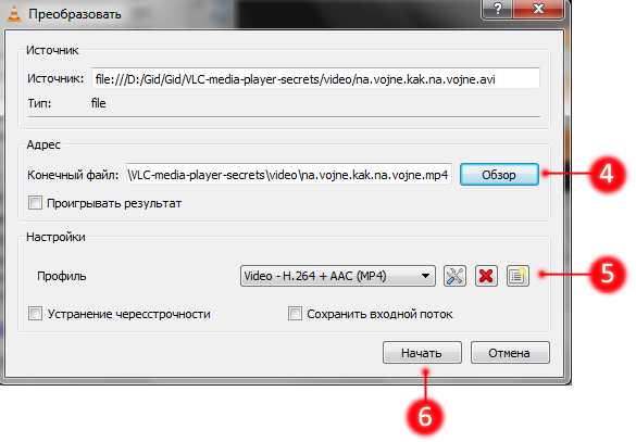 Далее потребуется ввести название результирующего файла, выбрать выходной формат с подходящим профилем для пережатия данных и запустить процесс обработки нажатием кнопки «Начать». При желании можно перейти в настройки профиля и поиграться с параметрами кодеков, разрешением картинки, битрейтом и прочими характеристиками аудио/видео вплоть до включения в конвертируемый ролик субтитров. Юстировка кодеков может потребовать от пользователя определенных знаний, почерпнуть которые всегда можно на страницах справочно-информационного сайта VideoLAN Wiki.